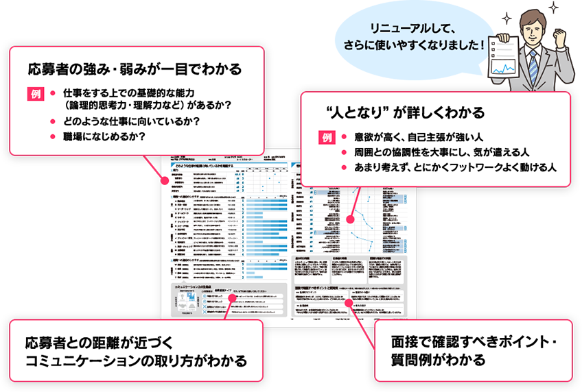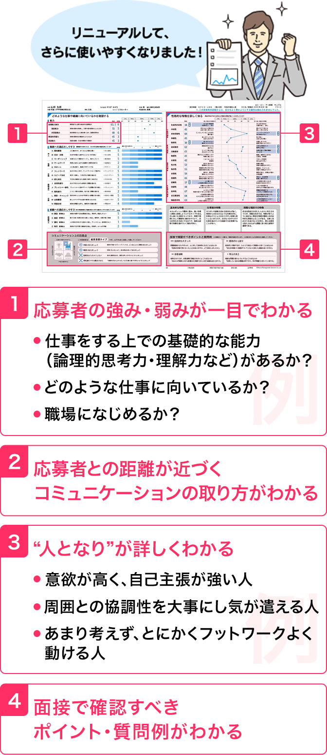仕事をする上での人柄・職務への適応性・組織への適応性がわかります。 新卒・中途・高卒採用などすべての目的で共通の内容です。 設問数:約300問 回答時間:30分~40分 ※実施方法によって異なる |
