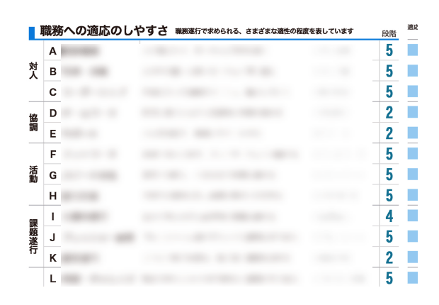 適応のしやすさ - どのような仕事に向いているのかが14項目・5段階で示されています。