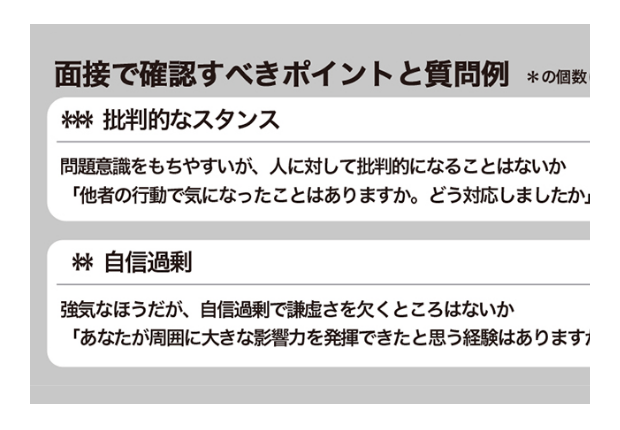 ポイントと質問例 - 25観点・77パターンの質問例で、面接対策が万全な学生が多い新卒採用でも、人物面の掘り下げ確認に役立ちます。