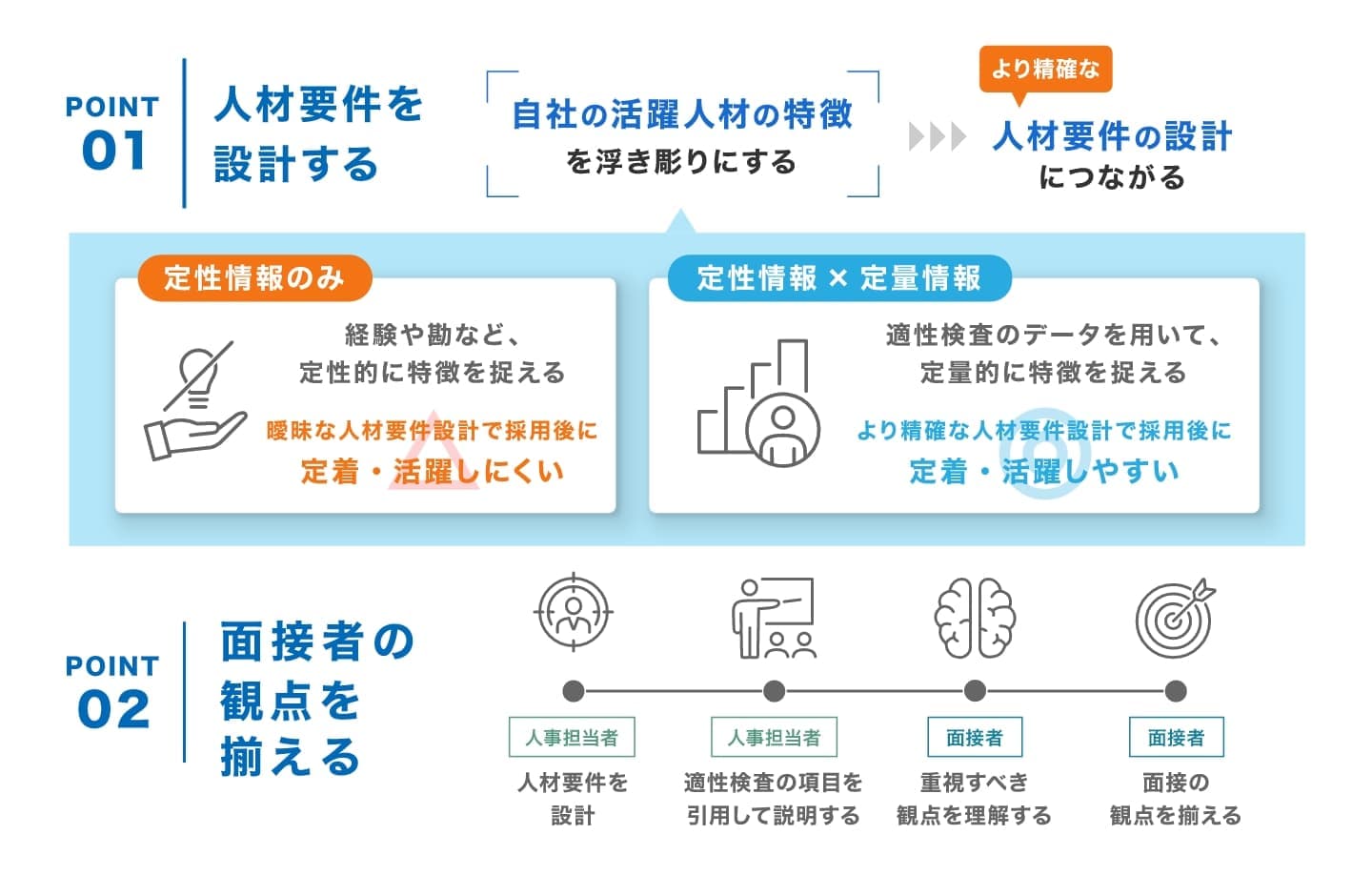 採用活動において、人材要件の設計は成否の鍵を握ります。人材要件を設計する上では、定性情報と定量情報の両方を踏まえることが重要です。経験や勘などの定性情報のみで設計した場合、採用した人材が定着・活躍しないという状況を招くこともあります。適性検査を用いると、自社の従業員の特徴を数値化できるため、「自社の活躍人材の特徴」を定量的に捉えることができます。定性と定量の情報を合わせ、活躍人材の特徴を浮き彫りにすることが、より精緻で適確な人材要件の設計につながります。