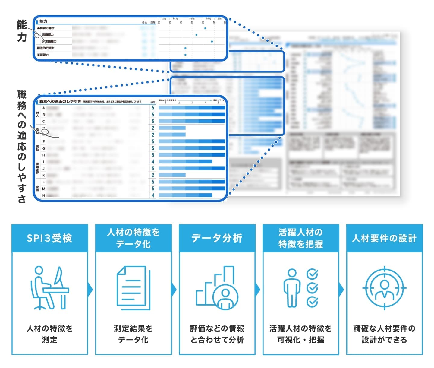 SPI3では「基礎能力」や「職務への適応のしやすさ」などの観点で、人材の特徴を測定し、数値化します。自社の従業員に実施し、そのデータをパフォーマンスや評価などの情報と合わせて分析することで、活躍人材の特徴を明らかにすることができます。それらを用いることで、より実態に即した精確な人材要件の設計が行えます。