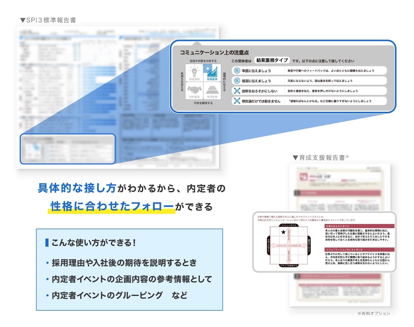 SPI3の報告書内の「コミュニケーション上の注意点」やオプションの「育成支援報告書」には、性格特徴の解説や、具体的な接し方が記載されています。それらを用いることで、内定者に採用理由や入社後の期待を伝える際などに、一人ひとりに合わせた適切な伝え方ができるようになります。