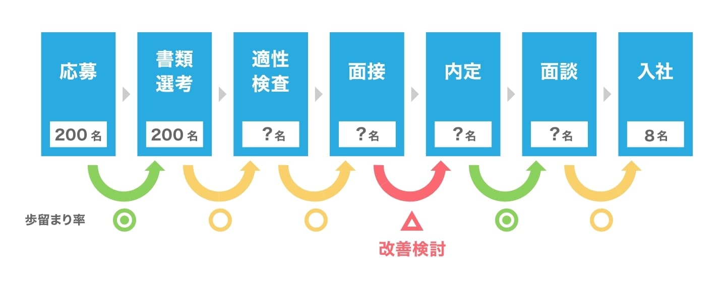 採用活動の終了後は振り返りを行い、次回に向けた改善検討を図ります。ここでは、最終結果としての内定者数の充足や、求める人材要件と内定者との一致を確認するだけでなく、選考プロセス全体を振り返ることも重要です。例えば、選考の各段階ごとの歩留まり率を確認することは、課題の明確化につながります。ここに適性検査も用いれば、各段階での人材要件に合致する人の割合もわかるようになるため、質的な振り返りがしやすくなります。