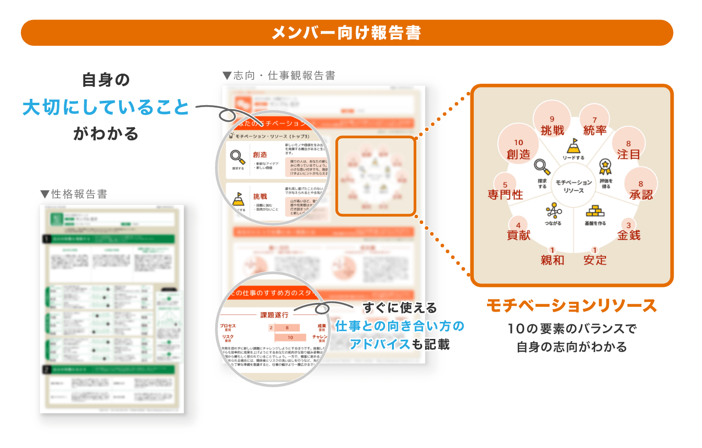 報告書では、性格や志向・仕事観の側面から、仕事に対する自身の得意なことや大切にしていることを詳細に把握することができます。数値情報だけでなく、仕事への向き合い方についてのアドバイスも記載されているため、目の前の仕事への意味付けや今後のキャリア検討に用いることができます。また、報告書を用いたガイダンスサービス(有料)によって、より効果的に自己理解やキャリア自律を促進することもできます。