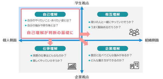 これらの理解の中でも、特に重要なのは自己理解です。なぜなら、自己理解、すなわち自分の強みや持ち味についての理解、やりたいことやありたい姿、働く上で本当に大事にしたいことは何かといったことについての理解は、自分に合う仕事や企業を判断するにあたっての基礎となるものであり、入社後にいきいきと働いていく上でも必要だからです。