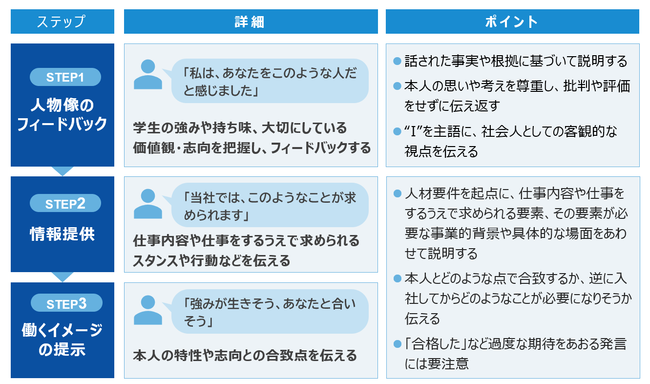 学生の自己理解を促進するための具体的な方法として、面接や面談におけるフィードバックがあります。対話を通じて把握した学生の人物像をフィードバックし、その学生に合わせた情報提供や、自社との合致点・具体的な活躍イメージの提示を行うことで、学生の被理解感や納得感を醸成することにもつながります。