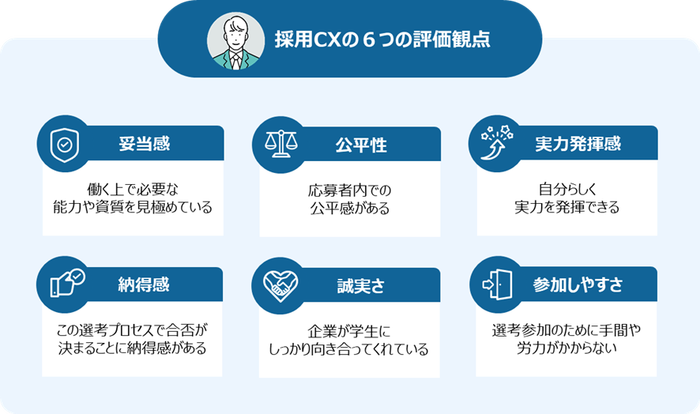 日本では2022年頃から採用CX・候補者体験という言葉が使われるようになってきていますが、採用CXを評価するための明確なフレームがない状況でした。弊社の調査では欧米の研究や調査を参考に、独自に「妥当性」「公平性」「実力発揮感」「納得感」「誠実さ」「参加しやすさ」の6つの評価観点を設定し、調査をしました。