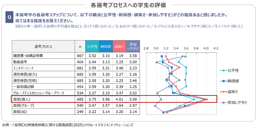 各選考プロセスにおける採用CX観点での評価を見てみましょう。選考参加意欲を左右する「誠実さ」が最も評価されているのは「個人面接」です。つまり、個人面接が採用CX向上における重要な要素を持っていることがうかがえます。![]()