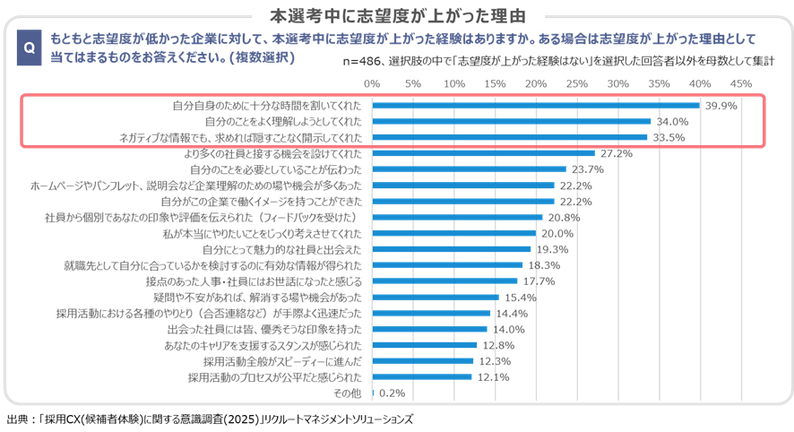 本選考中に志望度が上がった理由上位3つを見てみると、「自分のために十分な時間を割いてくれた」「自分のことをよく理解しようとしてくれた」といった、学生にしっかりと向き合おうとする企業の姿勢に加えて、「ネガティブな情報でも、求めれば隠すことなく開示してくれた」が挙げられています。すなわち、ネガティブな情報も隠さずフラットに開示することは学生の志望度向上につながると言えます。