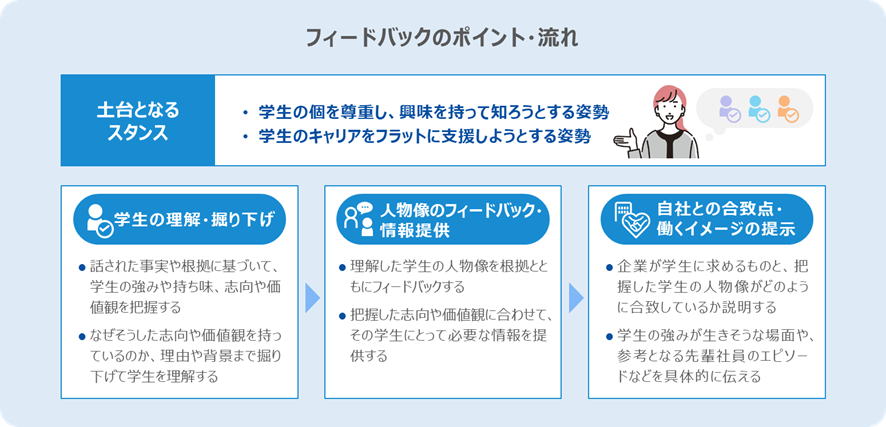 学生ごとにパーソナライズされたコミュニケーションには、学生に対するフィードバックも有効です。面接などで、学生に合った個別具体的なフィードバックを行うことは、企業として学生に向き合う姿勢があることや、学生の考えをしっかり理解していることを伝えることになります。それと同時に、学生と自社との合致点を伝えることで、学生の「働くイメージ」やその会社で働くことの納得感を醸成することにもつながります。そのためには、個々の学生をしっかりと掘り下げて理解する必要があるとともに、強引に惹きつけようとするのではなく、学生の個を尊重し、学生のキャリアをフラットに支援するスタンスが重要となるのです。