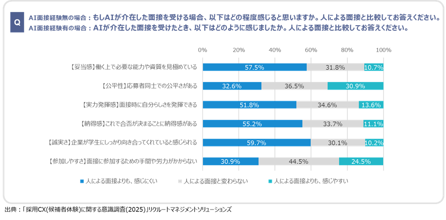 人による面接と比較して、AI面接では「妥当感」「実力発揮感」「納得感」「誠実さ」を感じにくくなる人の割合が過半数となりました。。一方で、「公平性」と「参加しやすさ」についてはAI面接の方が感じやすくなる人の割合が他の観点と比較して相対的に高いようです。先述の通り、選考参加意欲を上げる採用CXの観点上位3つが「誠実さ」「納得感」「実力発揮感」であることを鑑みると、AI面接よりも人による面接の方が、選考参加意欲向上には効果的なようです。